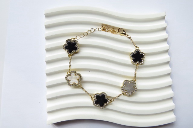 Black and White Rhinestone 5-Leaf Clover Bracelet